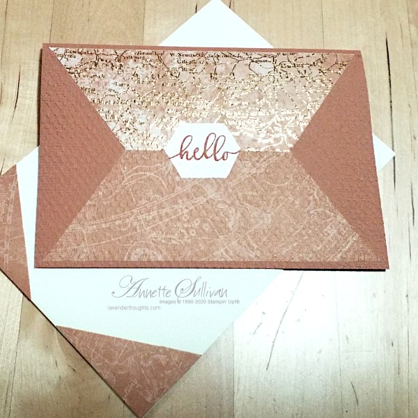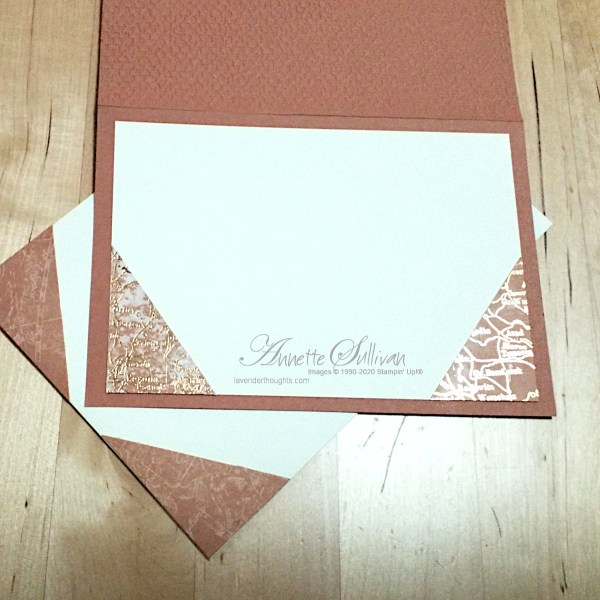 - 2 pieces of DSP – 14.3cm x 5cm (5¼” x 2″). Mark 3.5cm (1½”) in from each end on the bottom of one piece and on the top of the other piece. Cut out the corner triangles and use on the inside of the card and / or envelope.