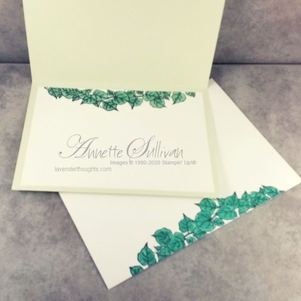 - Stamp the ivy at the top of the white piece and colour with Stampin’ Blends – Soft Sea Foam, Just Jade.