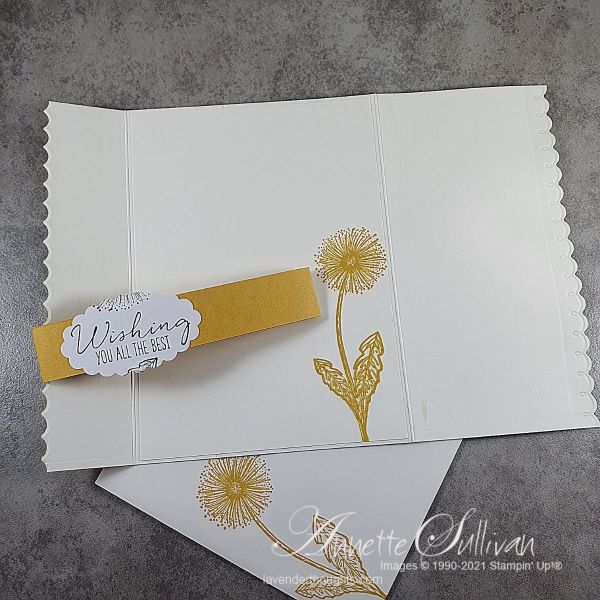- The gate fold was created using the edge die in the Peony Dies set with Thick White cardstock and Dandy Garden DSP.
