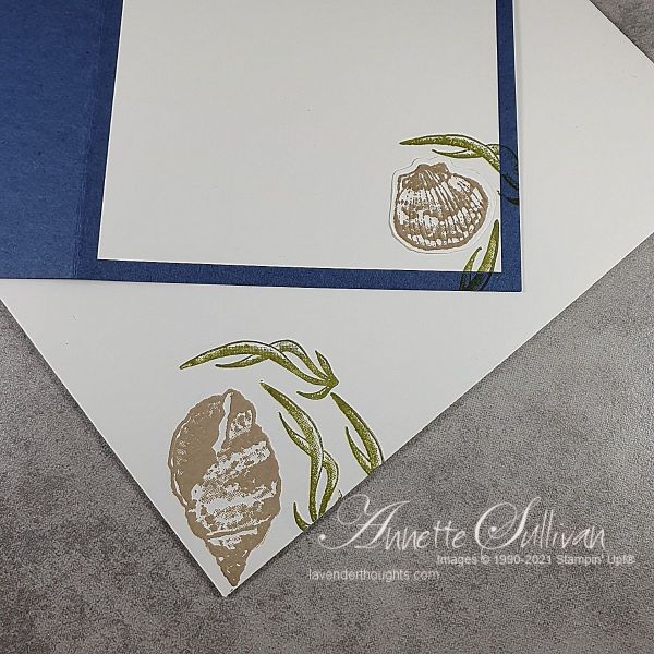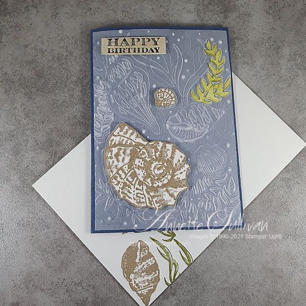 - The vellum layer has been embossed with the beautiful Seashells 3D Embossing Folder. A piece of Basic White was stamped with the shells using Crumb Cake ink and then die cut with the large Seaside Seashells Die, embossed and some of the shells and seaweed fussy cut. The seaweed piece was sponged with Old Olive ink.