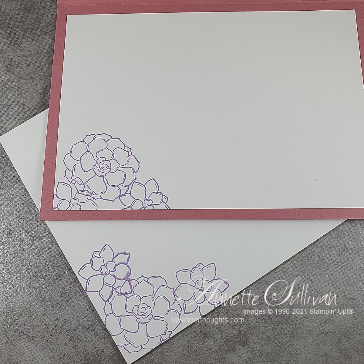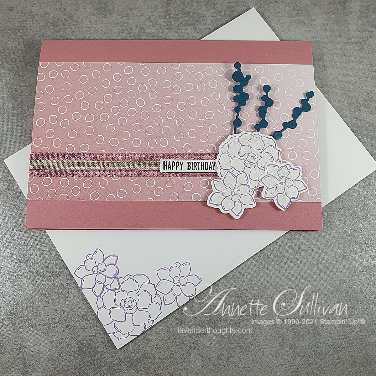 - Accessories: Potted Succulents Dies, Wink of Stella, Dimensionals, Opal Rounds, Pretty Peacock and Rococo Rose Scalloped Linen Ribbon, Shimmery White Embossing Paste