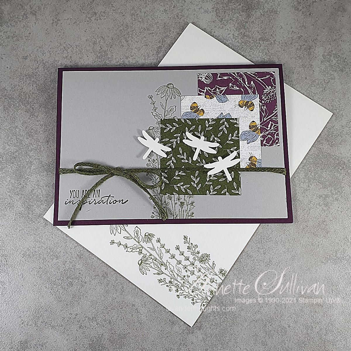 Stampin’ Up! held an OnStage AtHome event late last year. During this event for demonstrators, upcoming products were introduced. One of the bundles, Dragonfly Garden was available for purchase prior to the event and then during the event, measurements were given for three cards using this bundle. Each demonstrator was able to choose which Designer Series Papers were used for each card.