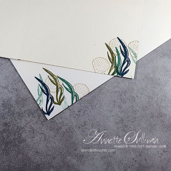 - Shells, seaweed and bubbles were then added randomly using Old Olive, Pretty Peacock, Just Jade, Calypso Coral and Crumb Cake inks.