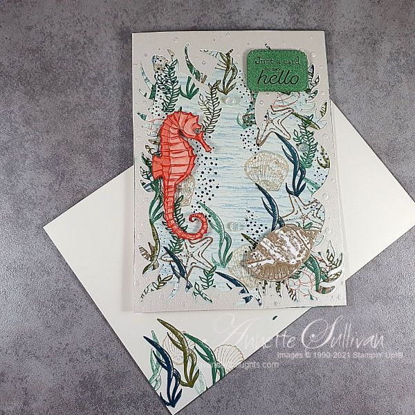 - The seahorse was stamped on Basic White with Calypso Coral and coloured with the matching Stampin’ Blends, fussy cut and attached with Dimensionals.