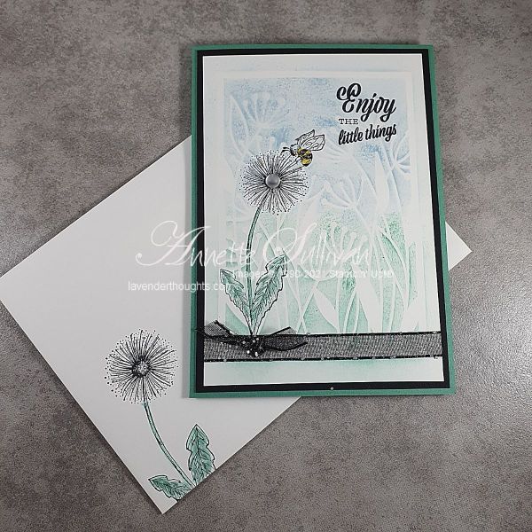 - A dandelion and bee from Garden Wishes were then stamped using Memento Tuxedo Black ink.