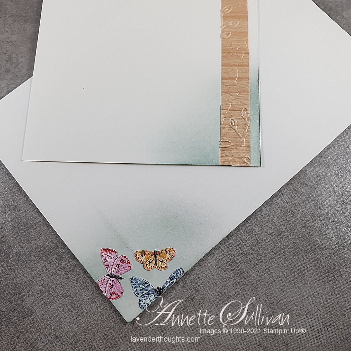 - Die cut the solid group of butterflies with Basic White cardstock. Place the negative die cut over another piece of white and use a Blending Brush to add colour to the negative spaces. Choose a light ink for the blending.