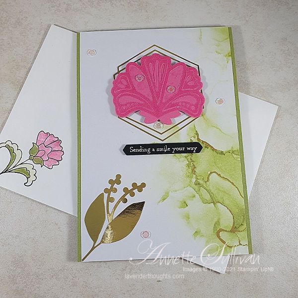 - The gold leaves, gold frame around the flower and the sequins are all from the Expressions in Ink Ephemera Pack. Don’t you think that they add an extra WOW to the card?
