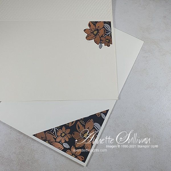 - The Thick Very Vanilla card base was embossed with the Tasteful Textile 3D Embossing Folder before adding the layers of Basic Black and Simply Elegant Specialty DSP.