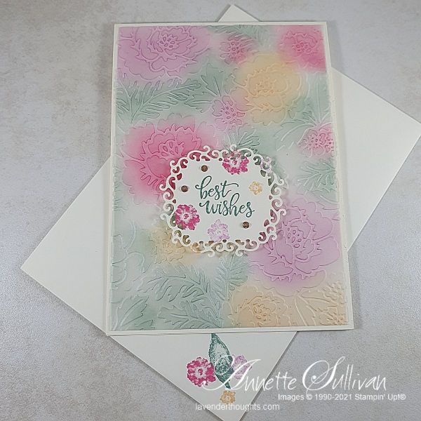 In one of my recent posts I showed you how beautiful the Pretty Flowers Embossing Folder looks on the In Color Shimmer Vellum. Today I am using plain vellum to emboss and then will be adding colour with Blending Brushes.