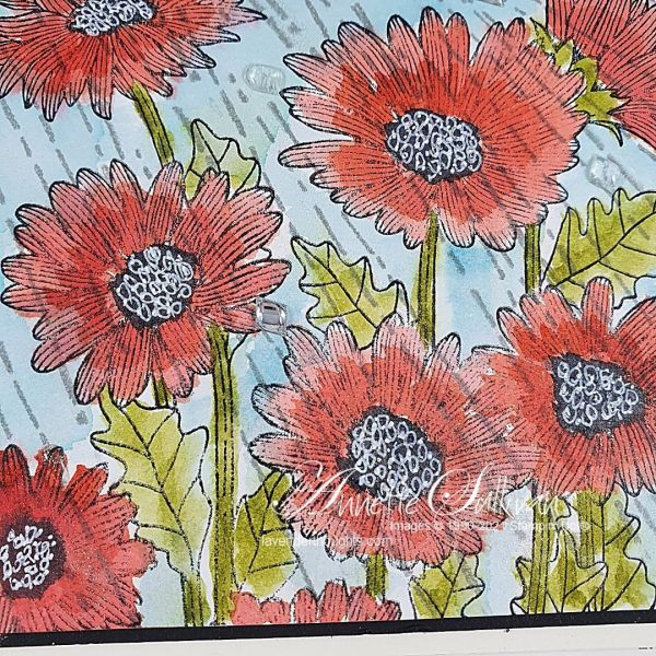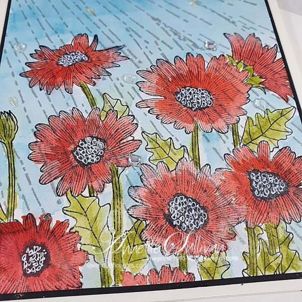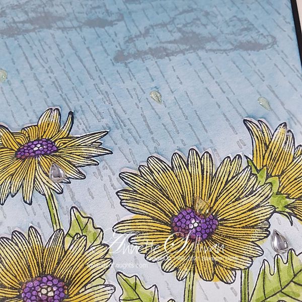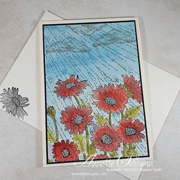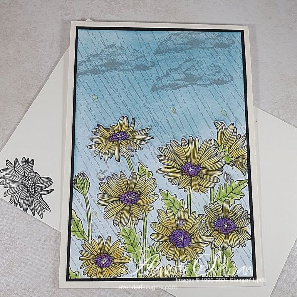 On this card the daisies have been coloured with Stampin’ Blends alcohol markers in shades of Daffodil Delight, Highland Heather and Granny Apple Green. The sky is Balmy Blue and the clouds and rain are in Smoky Slate.