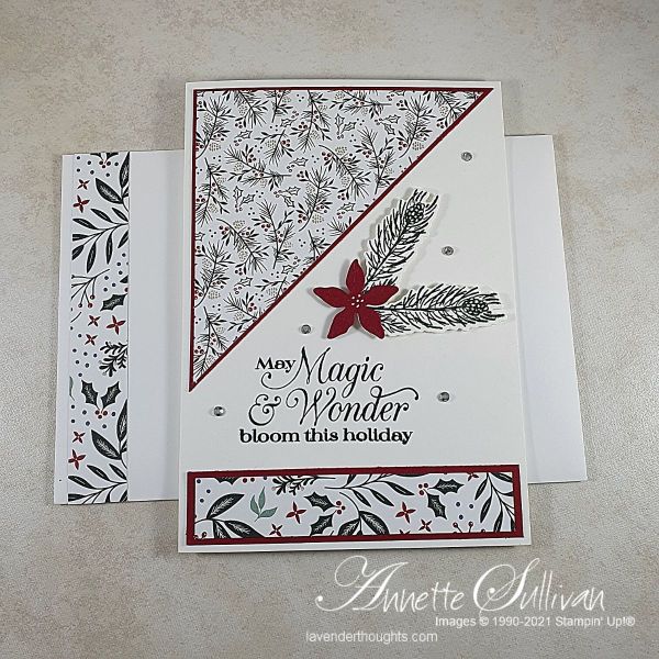 - To add some extra definition, I layered the DSP pieces onto Cherry Cobbler cardstock before placing on a Thick Basic White card base. Some quick stamping and die cutting with the Poinsettia Petals stamps and matching dies, a little bling and …. quick and easy card ready to go.