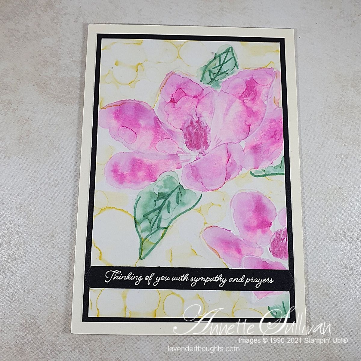 I have previously posted examples of the Blended Alcohol Background here. Today I have another 2 cards using the technique with dry embossing. Once again, thanks so much to Patty Bennett a US Stampin’ Up! demonstrator for the inspiration.