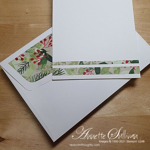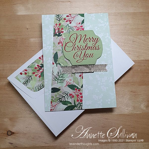 - The Painted Christmas Designer Series Paper has a lot of amazing designs. I used the Soft Sea Foam holly design to cover the front of a Thick Basic White Card base and then added a brighter piece with leaves and holly for the slanted layer.