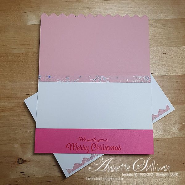 - Add a piece of Polished Pink to the inside of the card. Close the card and stamp a sentiment so that it can be seen when the card is closed.