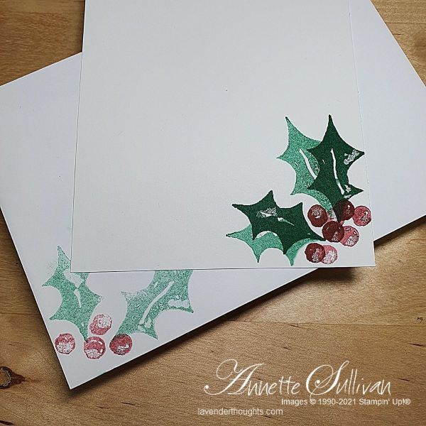 - Stamp holly with Shaded Spruce ink and berries with Cherry Cobbler ink on Basic White cardstock and die cut.