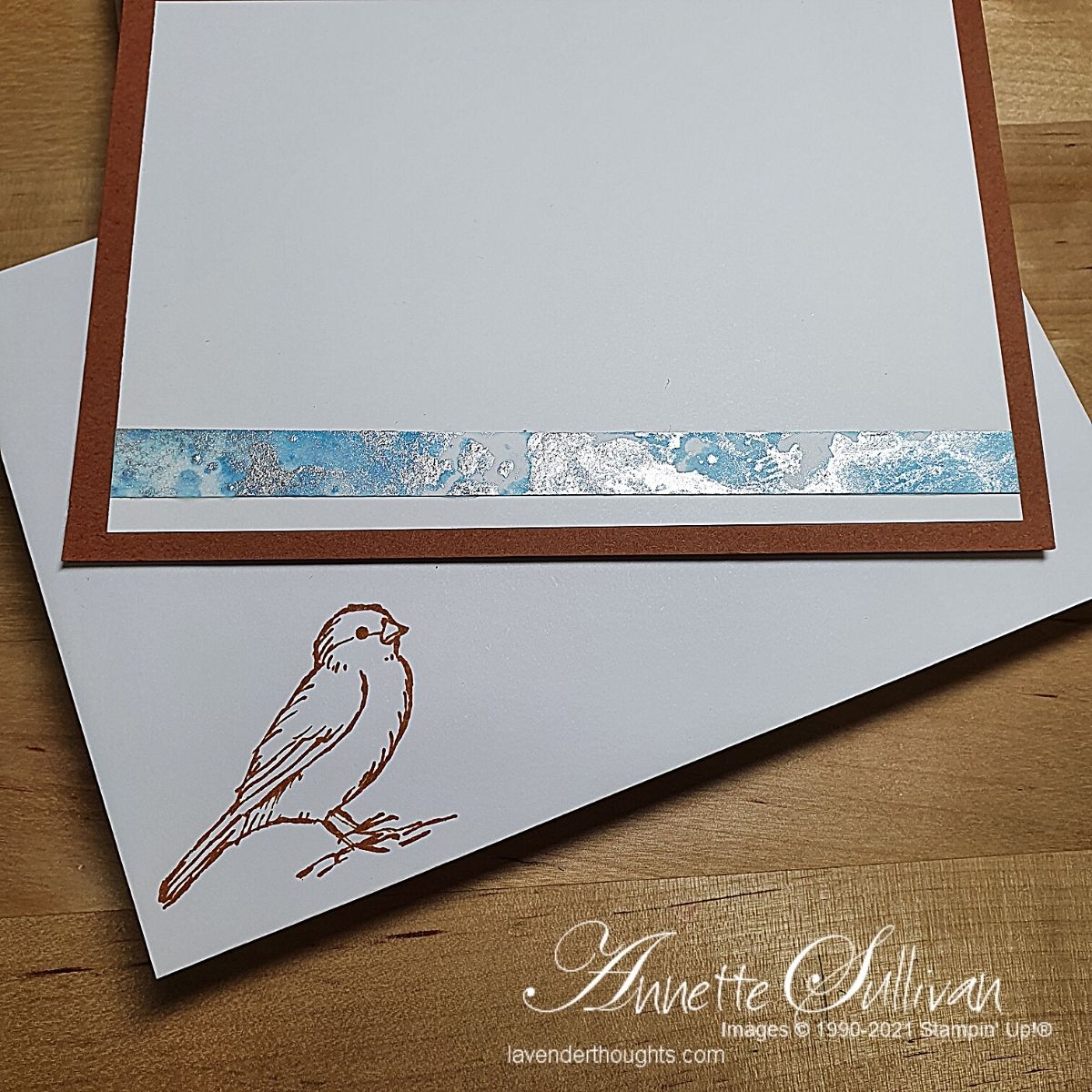 - Dip watercolor paper (or shimmery white cardstock or Basic White cardstock) into the puddle. Allow to dry (or heat set) then dip again. Continue dipping and heat setting until desired background is achieved. The process of dipping and heating builds up layers of ink on the cardstock creating a textured look.