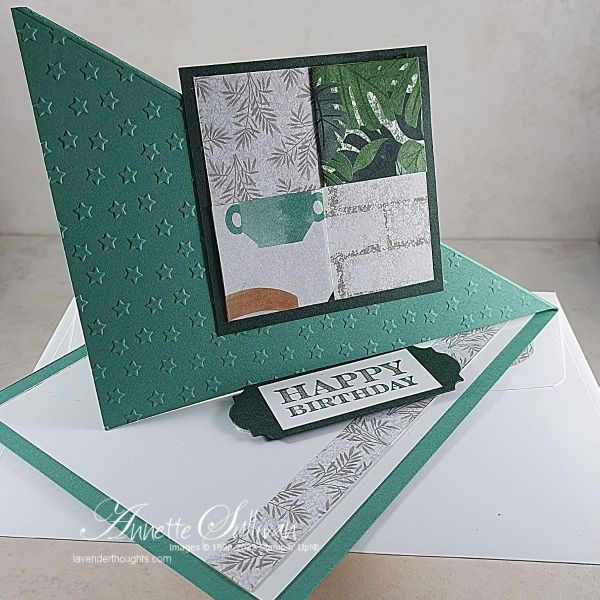 - Emboss or stamp the card base then add the DSP pieces straight or on an angle.