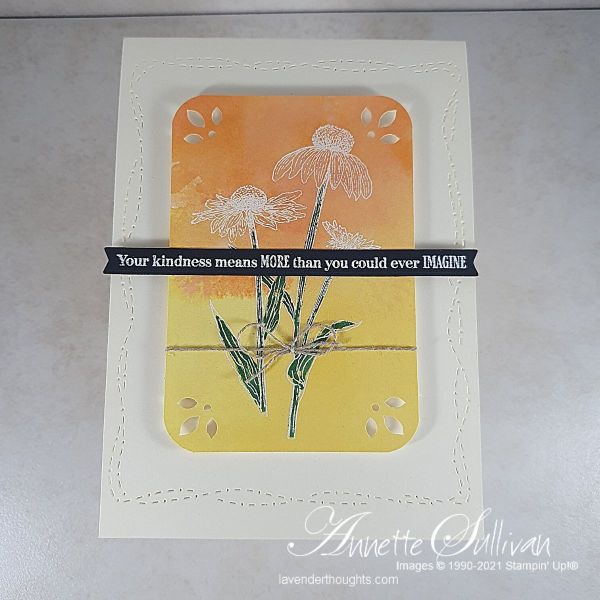 - Accessories: White Embossing Powder, Detailed Trio Punch, Linen Thread, Messages Die, Stitched with Whimsy Dies