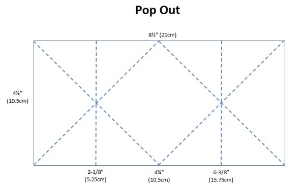 - See diagram above for the pop out measurements. Score on the dashed lines and fold closed to origami diamond shape. Adhere the back of the diamond to the centre of the open card base. Add adhesive to the closed diamond pieces and close the card base to adhere them to the gate fold flaps.