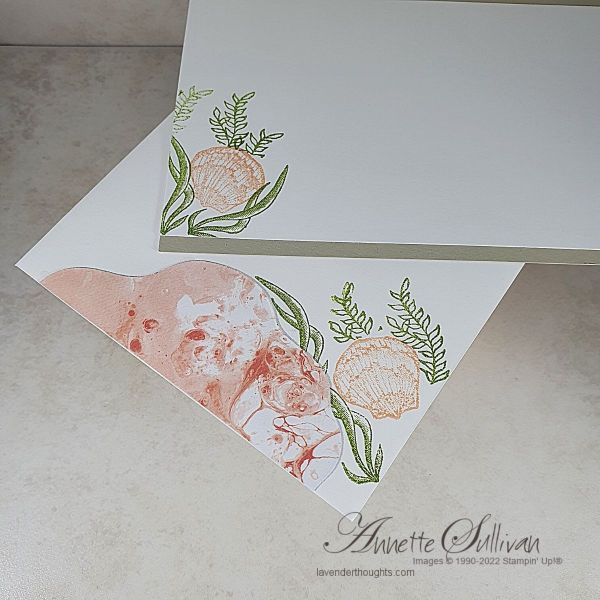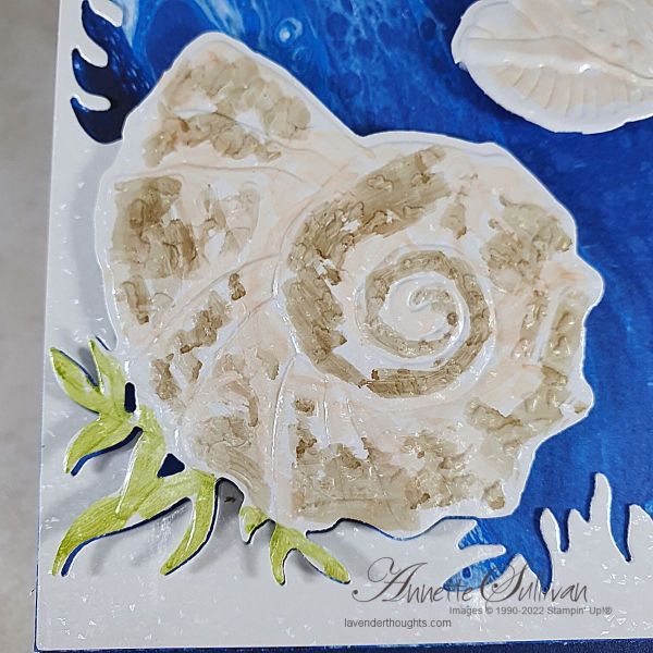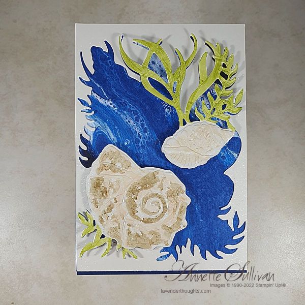 - The shells and sea grass used Mother of Pearl Specialty Paper with the Seaside Seashells Dies and coordinating Seashells 3D Embossing Folder. They were coloured with Petal Pink and Granny Apple Green Stampin’ Blends alcohol markers.