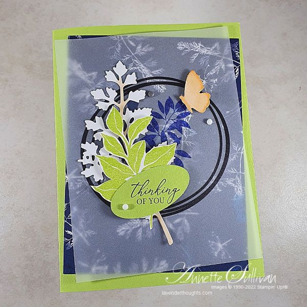 Today is the start of the 2022 Annual Catalogue (link to PDF below) and there are so many new products from which to choose. I have a series of cards for you using the Botanical Layers stamp set with the Lovely Layers Vellum and the 2022-2024 In Colors (Sweet Sorbet, Parakeet Party, Starry Sky, Tahitian Tide, Orchid Oasis).