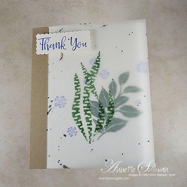 - I used a piece of the plain vellum rather than the splattered pattern piece and then used Memento Tuxedo Black ink and splattered it myself. The leafy image was then stamped on the vellum with Garden Green ink.