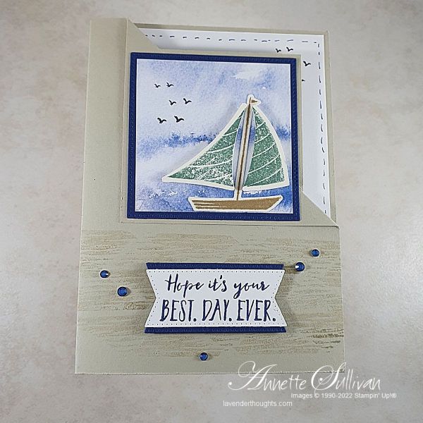 It has been quite a while since I posted a folded corner card. Today I have a couple of cards using this technique and the Let’s Set Sail stamp set and coordinating Sailboat Builder Punch. I also have a PDF for you to download as well as a link to a video I did to show you just how easy it is to make.