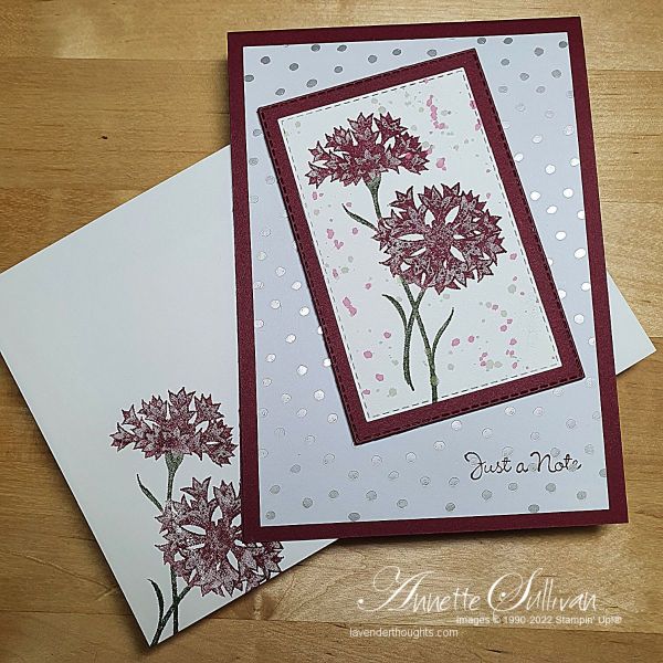 Card 3: This showcases the pretty German cornflower which has been stamped with Merry Merlot and Mossy Meadow inks on Basic White cardstock, splattered with a Water Painter and the same inks and then die cut with a Stitched Rectangle Die and layered onto Mossy Meadow. The silver spotted layer is from the same pack as the spotted and striped layers in the previous cards. Merry Merlot is the card base.