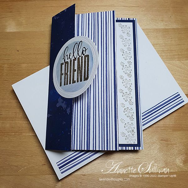 Card 1: This one uses a current DSP – Sun Prints with Night of Navy cardstock and Botanical Layers and Biggest Wish stamp sets.