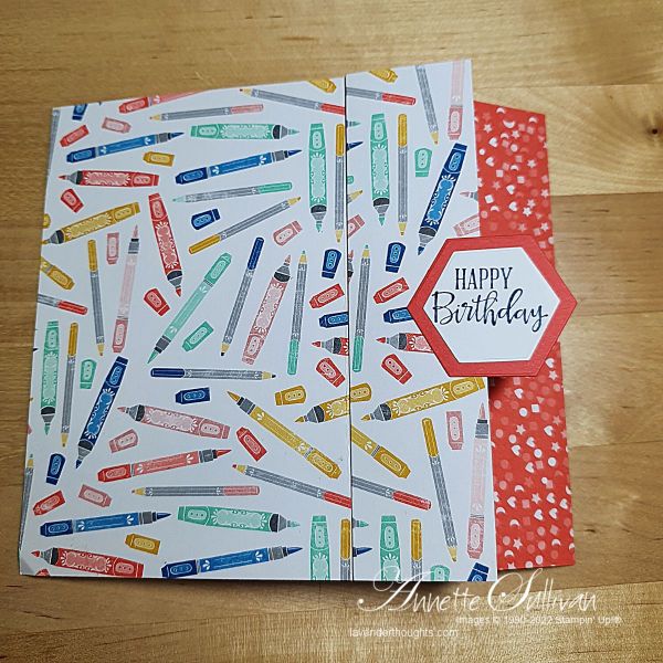 - Stamp a sentiment, die cut and attach to the 1½” front panel.