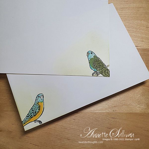 Inks used for the birds were Memento Tuxedo Black (outline), Tahitian Tide, Daffodil Delight, Balmy Blue, Old Olive and Parakeet Party.