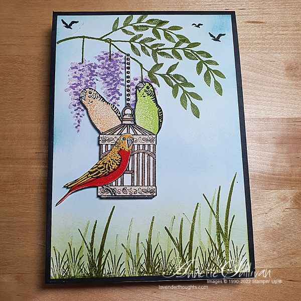 The birds from the Pretty Birds stamp set were coloured using the two-step stamping method (actually 3 step for these birds) and then fussy cut and added to the art panel using Dimensionals.