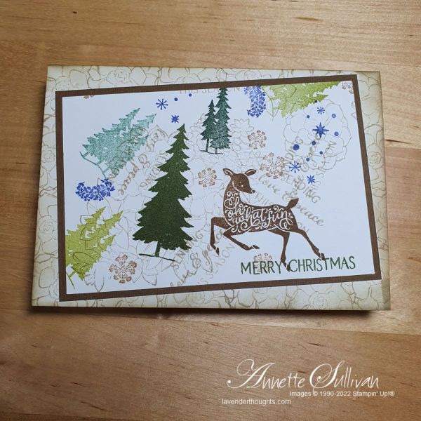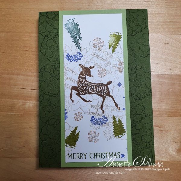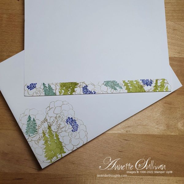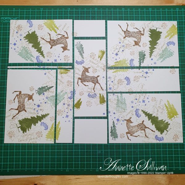 Here is the A4 sheet as stamped. I used Peaceful Deer, Simply Succulents and Botanical Layers stamp sets with Mossy Meadow, Pear Pizzazz, Soft Succulent, Soft Suede, Starry Sky and Sahara Sand inks.