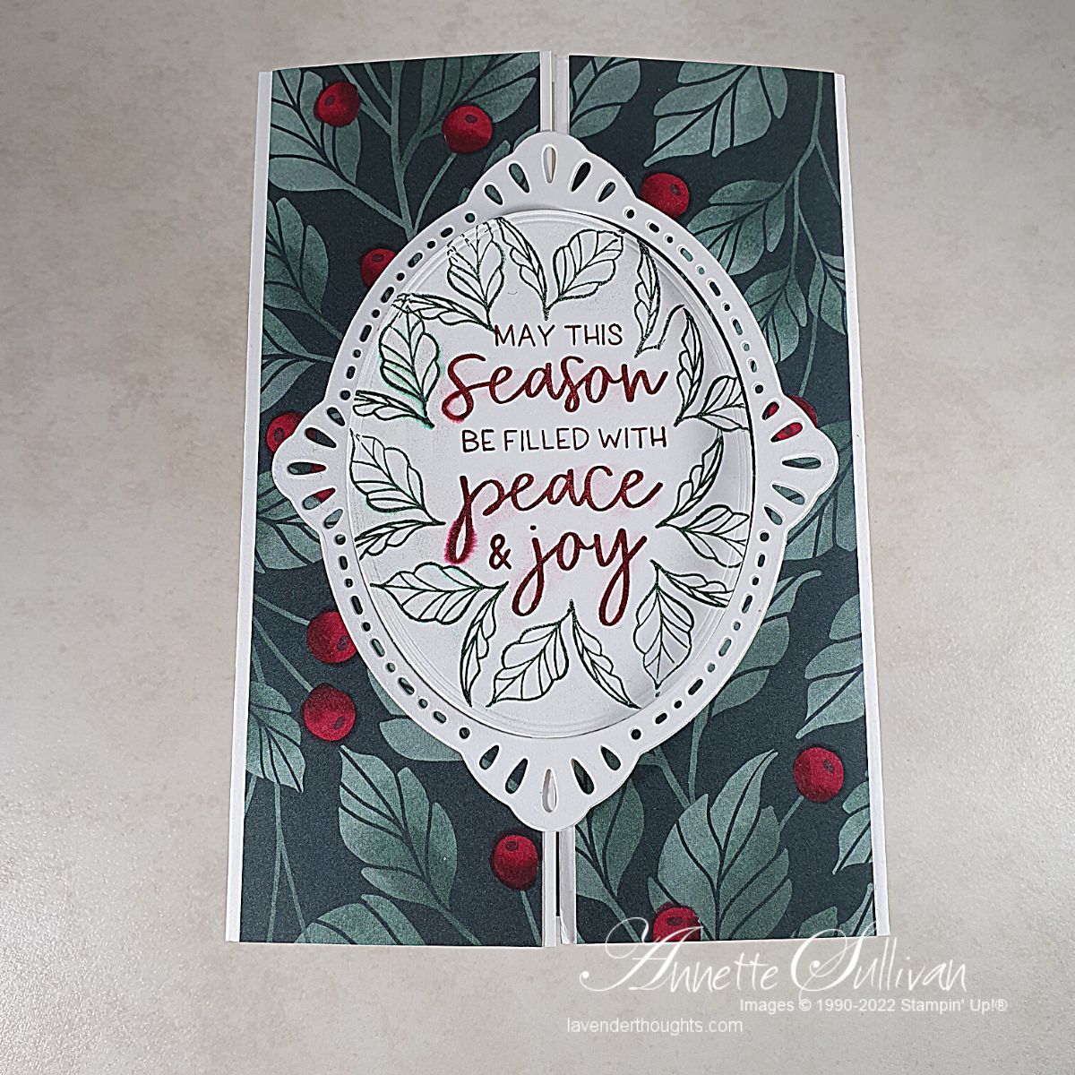 The last one for this week. This is a Locking Gate Fold card. The berries on the DSP have been coloured with Cherry Cobbler Stampin’ Blends alcohol markers. Download the PDF with measurements and instructions here.