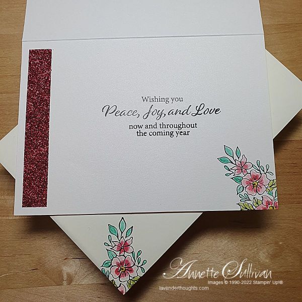 The sentiment from Framed & Festive stamp set (only available until 4 January 2023) was stamped on the card base. Some bling was provided with Iridescent Rhinestones.