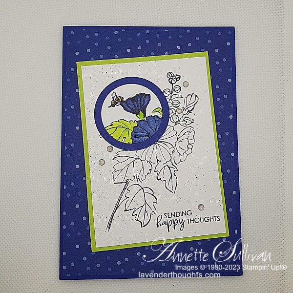 Card 1: This card uses the Spotlight Technique to showcase this pretty image. Colours used are Starry Sky and Parakeet Party.