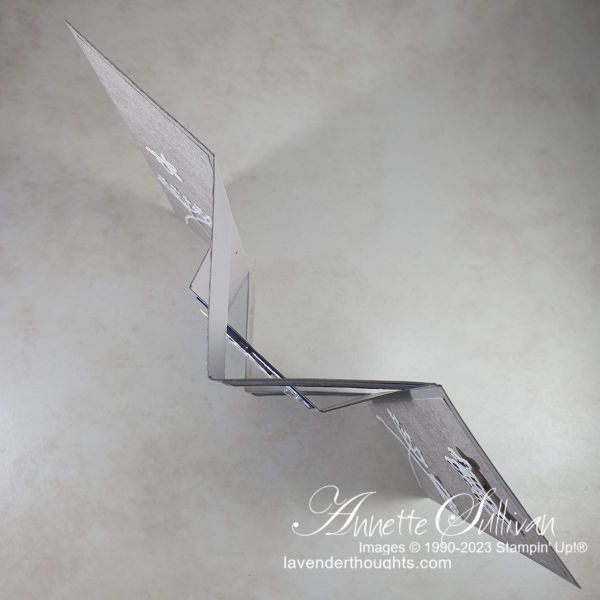 This Flat Flap Fun Fold card uses Sun Prints DSP, Dainty Delights Stamp Set and Dies, Charming Sentiments Stamp Set, Sentiment Silhouette Dies with Gray Granite, Night of Navy and Basic White cardstock. Iridescent Pearls add some bling.