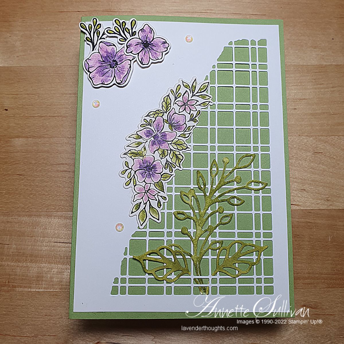 This one uses the ‘lattice’ die on Basic White against a card base of Pear Pizzazz. The images were stamped on Shimmery White, coloured with inks and Water Painters then die cut and added with Dimensionals. Some Iridescent Rhinestones add extra sparkle.