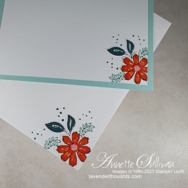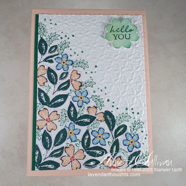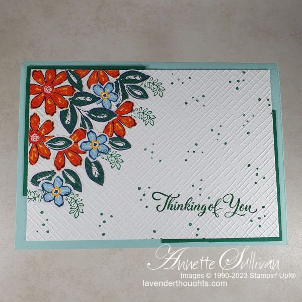 I decided to change the colour of the large flowers to Sweet Sorbet using Stampin’ Blends alcohol markers. The ‘hash’ embossing folder was used here. For a different look I added small layers of Shaded Spruce to the upper left and lower right corners of the art panel. The card base is Pool Party.