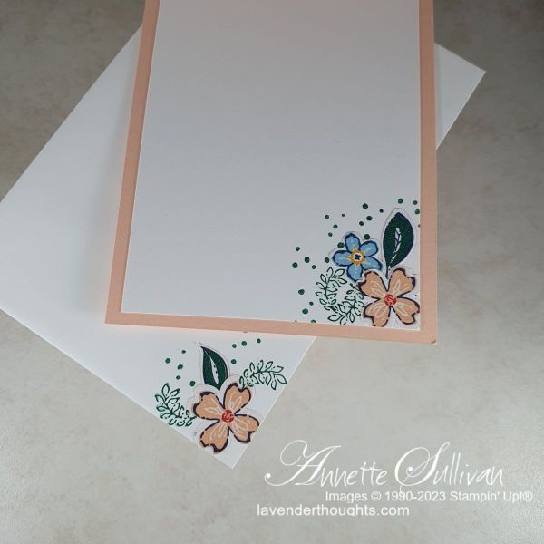 They have been created using the Regency Park Designer Series Paper (retiring on 1 May 2023) and the Basics 3D Embossing Folders. The flowers were punched with the Petal Park Builder Punch and the leaves were fussy cut and adhered to a layer of Basic White cardstock. Some leaf sprigs and ‘dots’ were stamped to give some added detail. The panel was then embossed and attached to the card base.