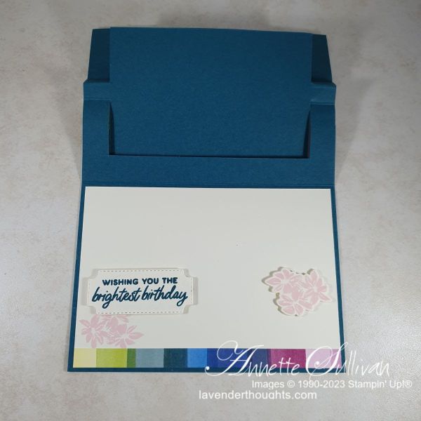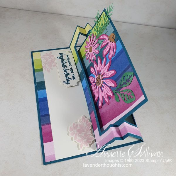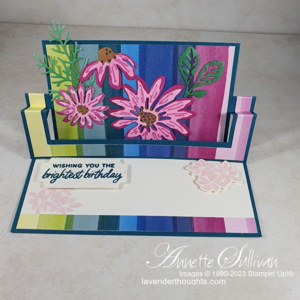 Card 2: Like the first card, this one has a layer of DSP on the front of the card. Pretty Peacock and Very Vanilla cardstock together with Bright & Beautiful DSP were used with the Cheerful Daisies stamp set and matching dies.