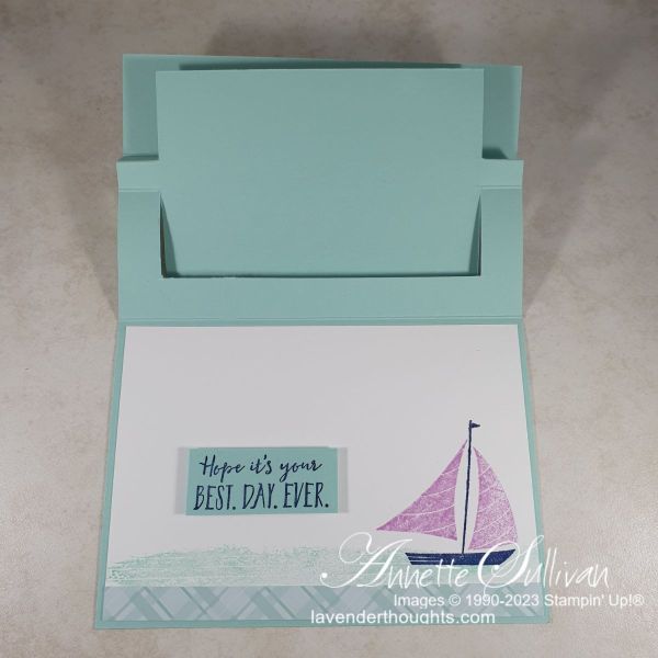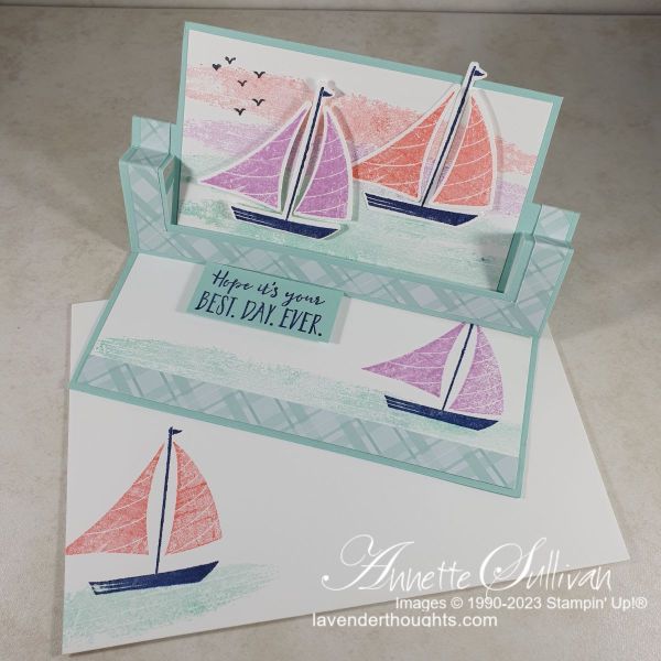 Card 1: This uses the Let’s Set Sail stamp set and coordinating Sailboat Builder Punch. The stamp set retires tomorrow 1 May 2023 but the punch will carry forward to the 2023 Annual Catalogue. Pool Party and Basic White cardstock together with Subtles DSP with Pool Party, Night of Navy, Flirty Flamingo and Fresh Freesia inks were used here.