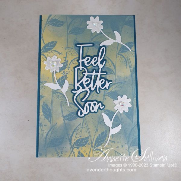 - Die cut the Feel Better Soon words and three flowers and three stems with Basic White.