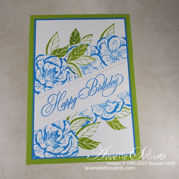 - Starting in the lower left hand corner of the art panel, stamp the largest flower with Azure Afternoon ink. Cover it with a mask and stamp some leaves using Granny Apple Green ink.