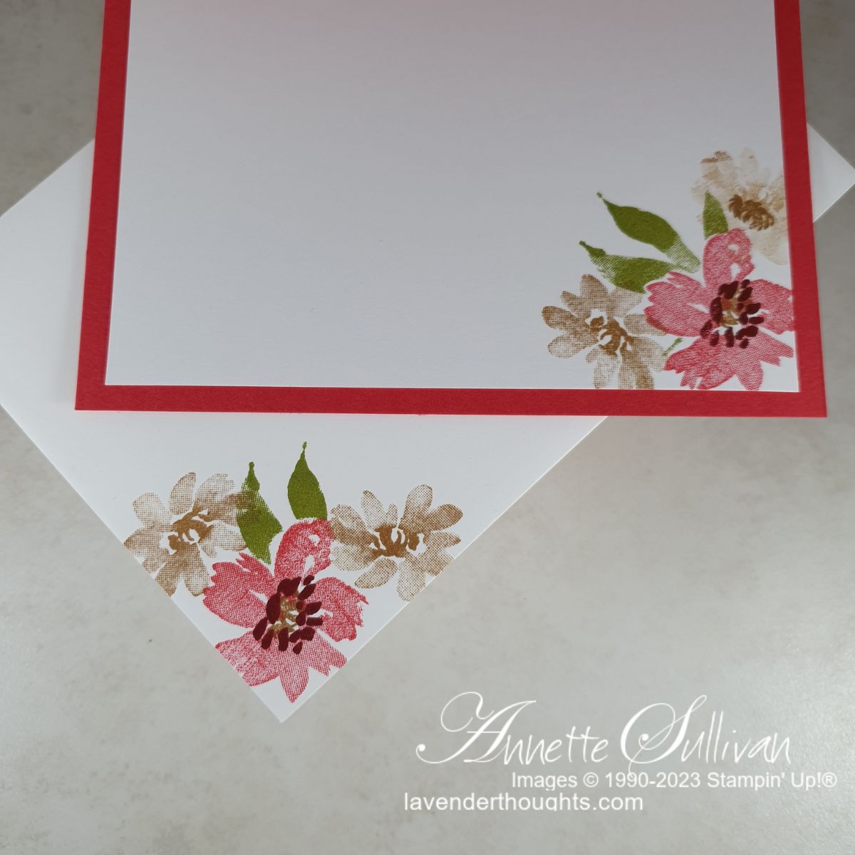 For this one I stamped the images individually using Sweet Sorbet, Cherry Cobbler, Pecan Pie and Mossy Meadow inks. The art panel is layered on Basic Black on a Sweet Sorbet card base.