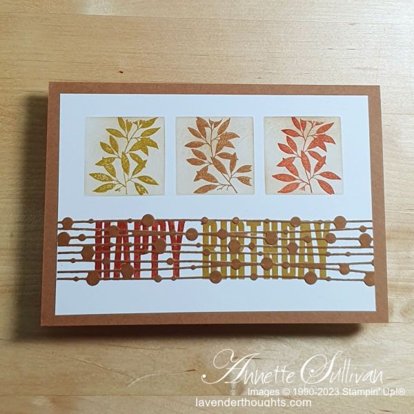 - Line up the masking paper on a piece of Basic White and sponge over the negative squares with Crumb Cake ink, Keep the mask in place and stamp the leaf image over the sponging with Wild Wheat, Pecan Pie and Cajun Craze inks.