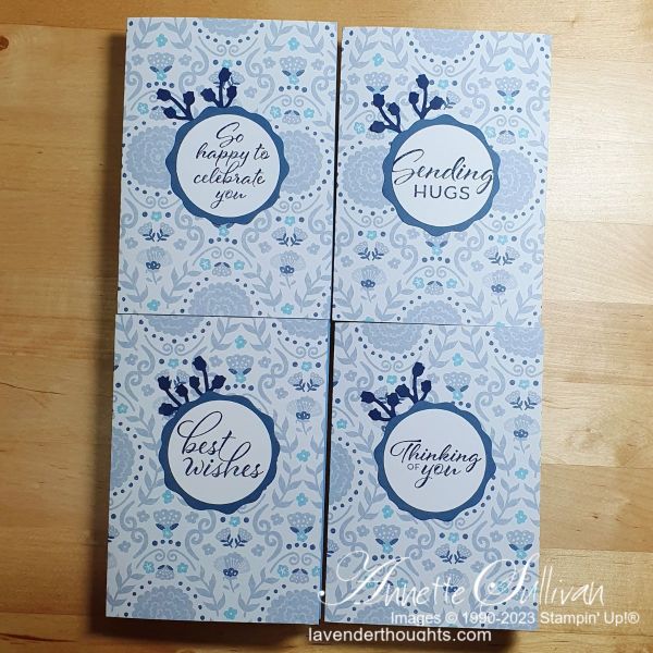 Here is a quick and easy way to create a set of four matching cards using a 12″ x 12″ piece of DSP, an A4 piece of cardstock in a matching colour, some scraps for the sentiment layer and accents and some neutral cardstock for the inside and sentiment. This is a version of a One Sheet Wonder.
