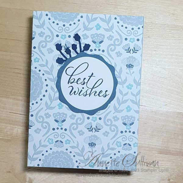 - Punch a piece of Misty Moonlight with the Decorative Circle Punch and attach to the back of the sentiment layer.