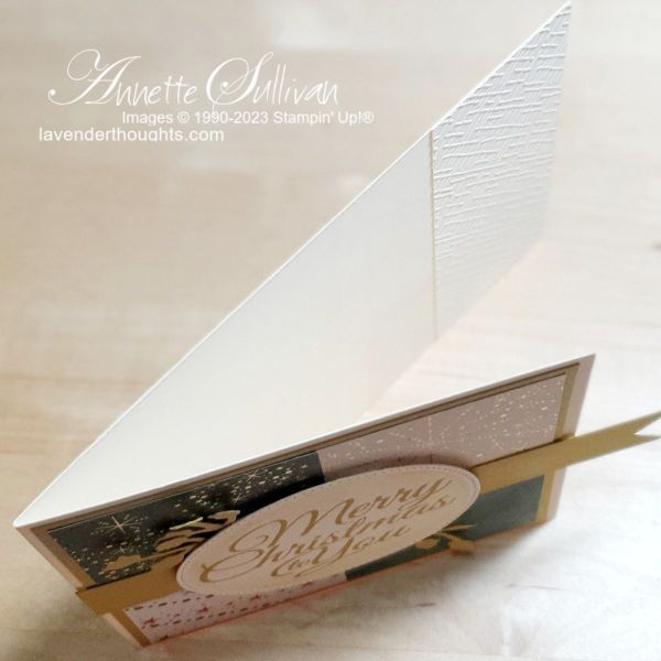 - Die cut a piece of Very Vanilla with a Stylish Shapes Die and stamp with a sentiment from Holly Jolly Wishes. Add to the centre of the DSP panel with Dimensionals.
