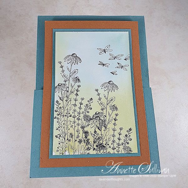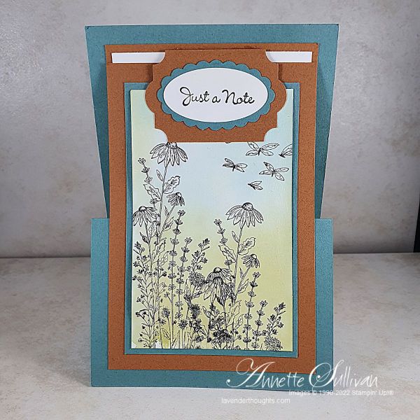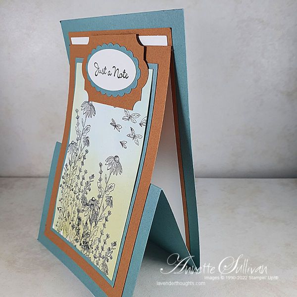 Card 1 – this one tucks the easel into the top of the card. I have used the now retired Dragonfly Garden stamp set and the Everyday Label Punch. Lost Lagoon, Cinnamon Cider and Basic White cardstock were used.
